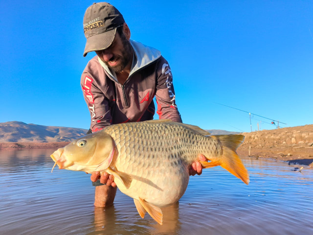 After 7 days without a bite, or even a sign of a fish, I did a bit of research. Then, based on what I had found out and past experiences carp fishing, we decided to change up our tactics. I moved my rig to a completely new area that we had not baited or fished at all. It was in the area where we knew the previous group baited and fished. I dropped a single handful of maize over my rig and went back to shore. It wasn’t even an hour later, and BAMM!!! On the stroke of midday, a slow pickup led to an amazing capture. A true slab of “Moroccan Gold”!